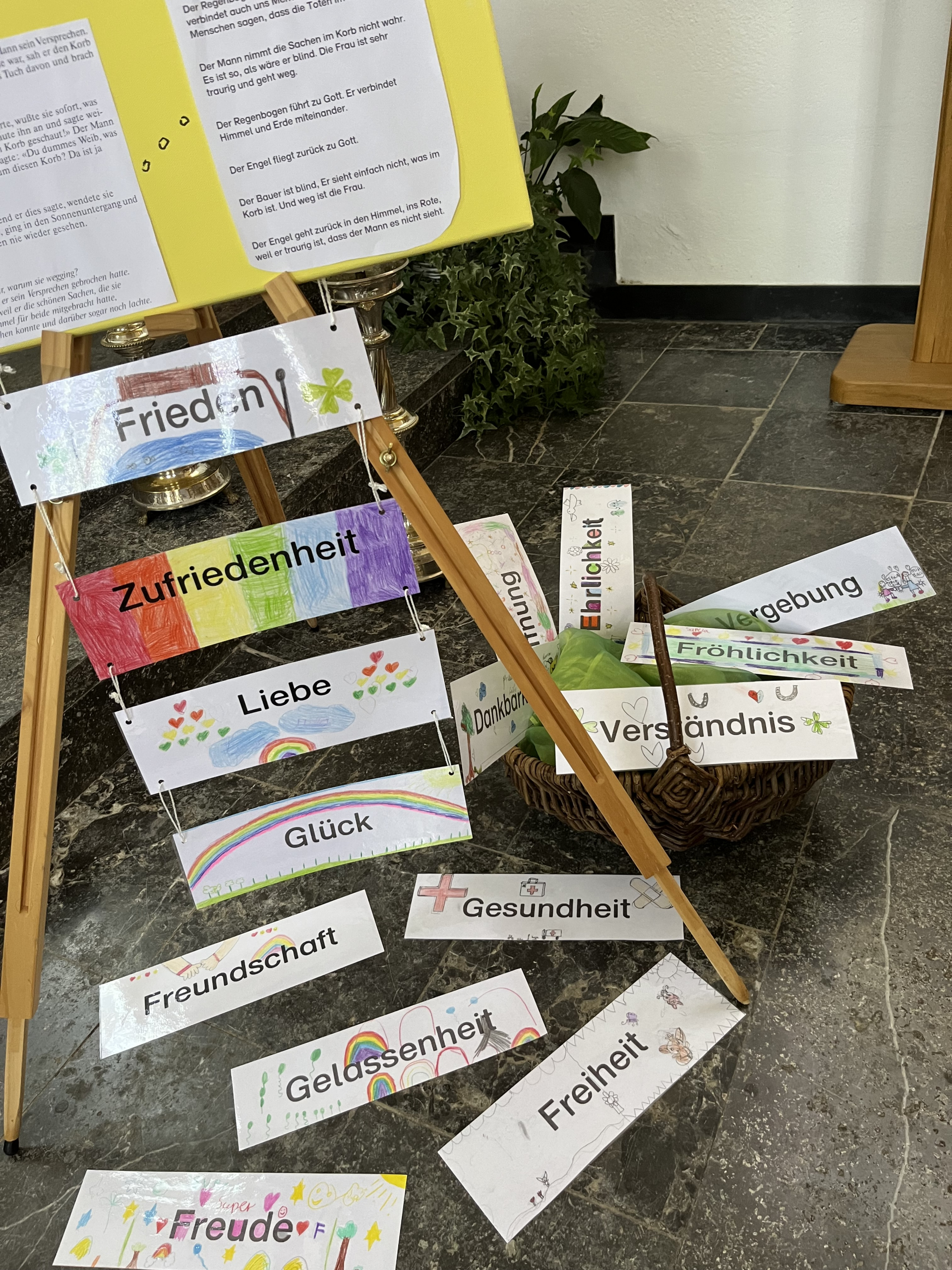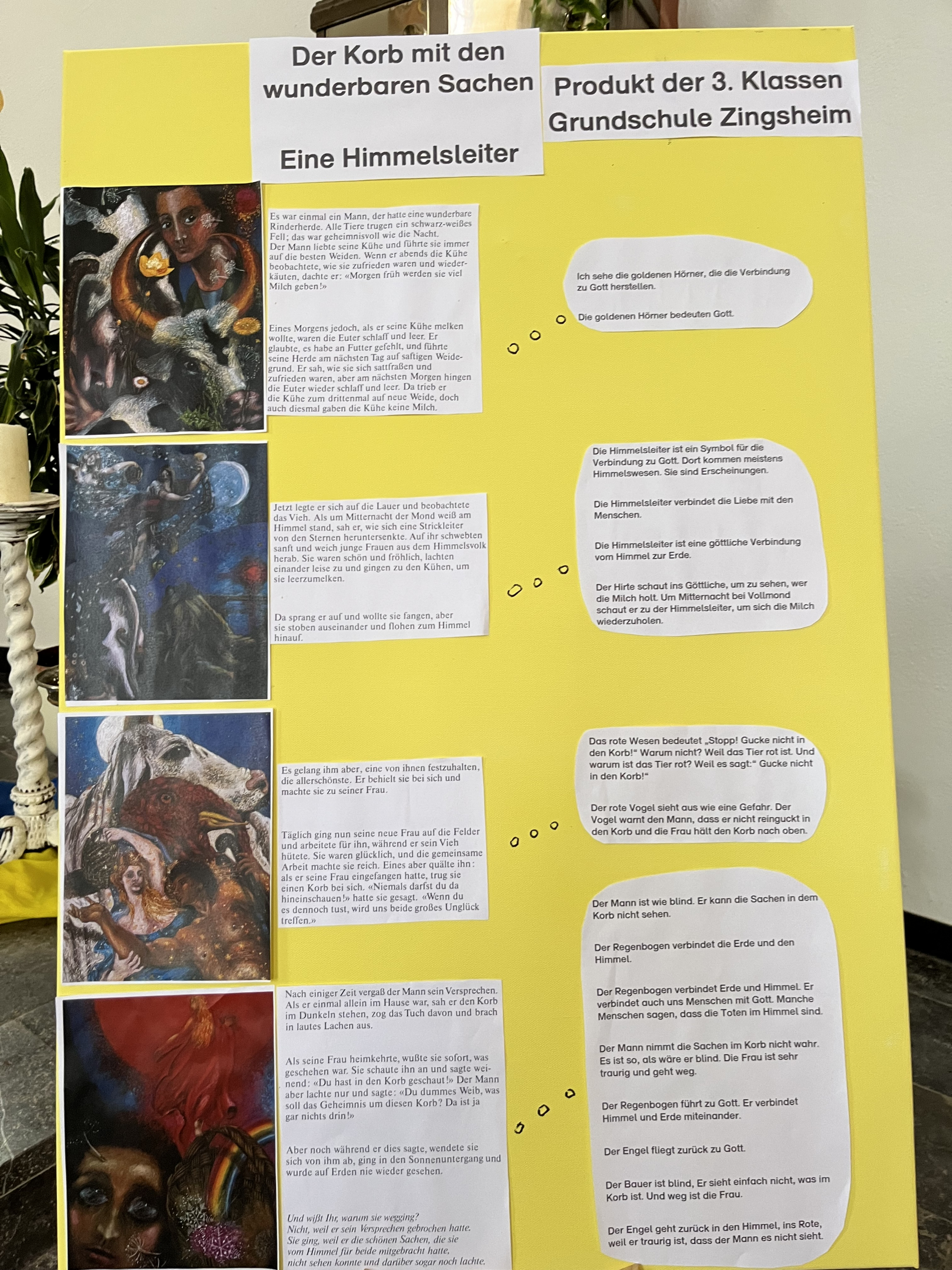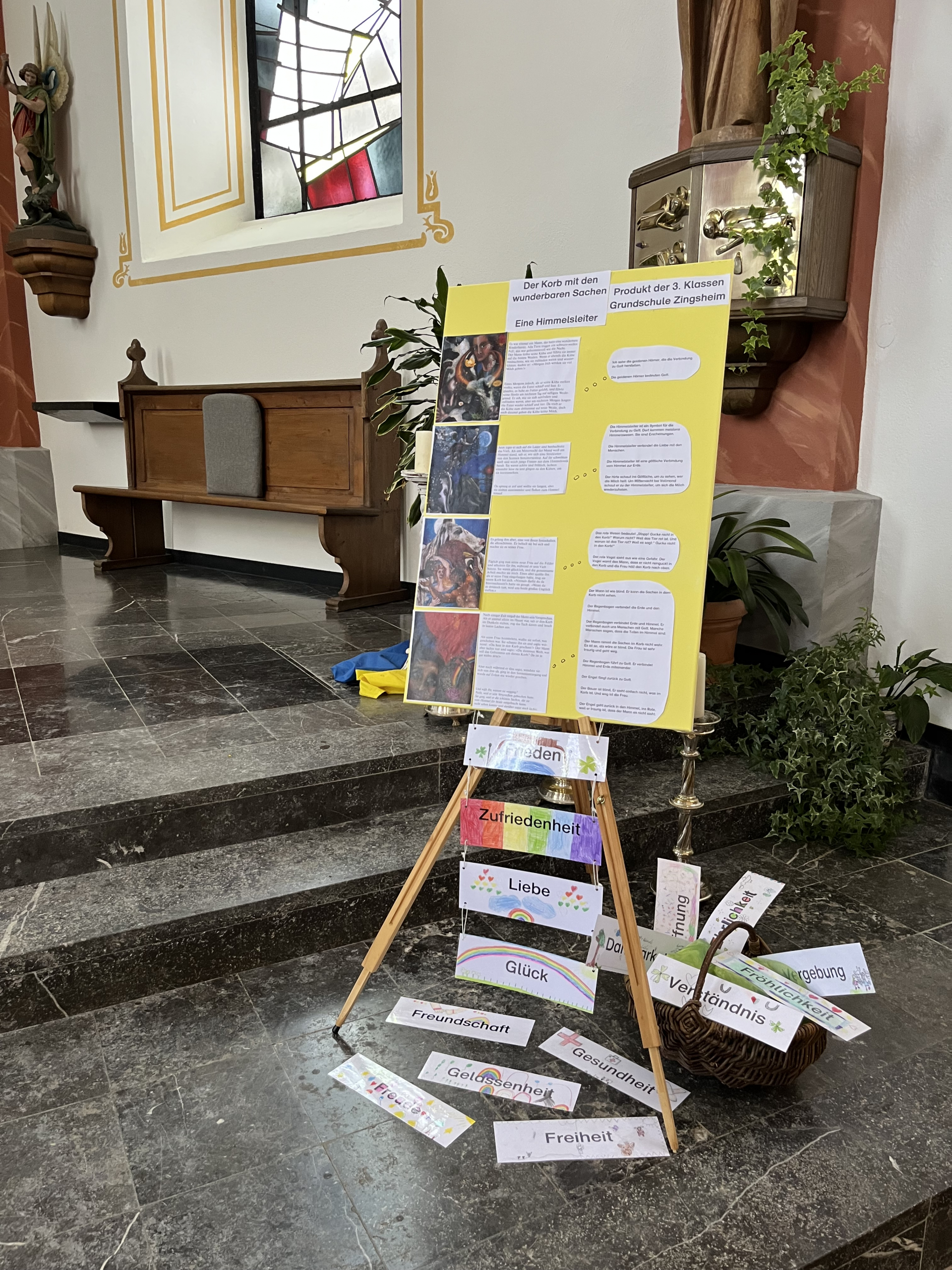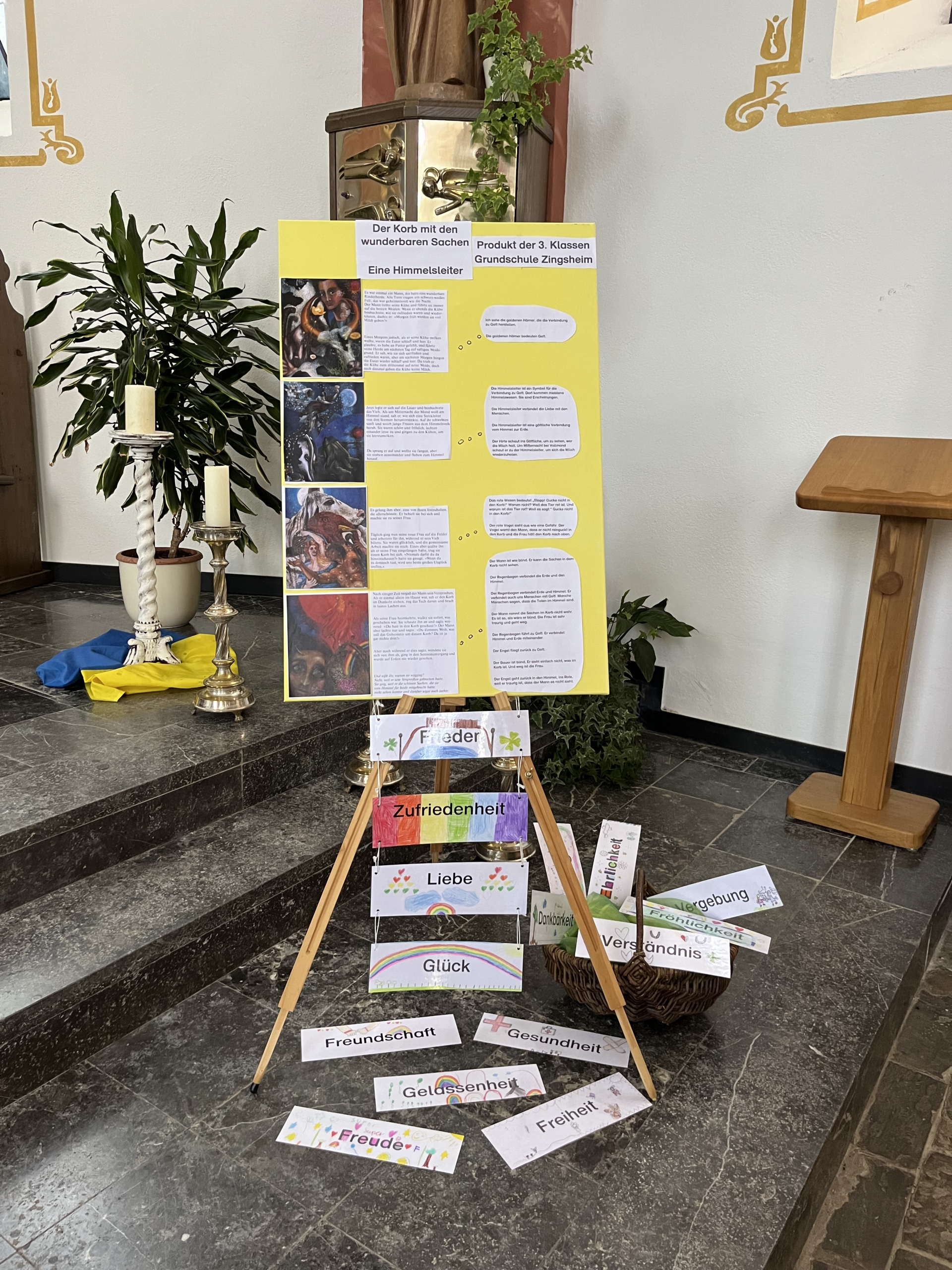 Vielen Kindern war sie schon bekannt. An der Tondorfer Kirche wurde eine Himmelsleiter aufgebaut, sichtbar und beleuchtet bei Nacht. Aber welche Bedeutung hat sie? Das versuchten wir, Frau Strebinger und Frau Schmitz, in einigen Religionsstunden mit den Kindern der jetzigen dritten Klassen in Zingsheim herauszubekommen. Die Geschichte „Der Korb mit den wunderbaren Sachen“ mit vier symbolhaften Bildern diente als Grundlage unserer Erarbeitung. Das Ergebnis der tiefgreifenden Gedanken der Kinder steht nun sichtbar in der Kirche.